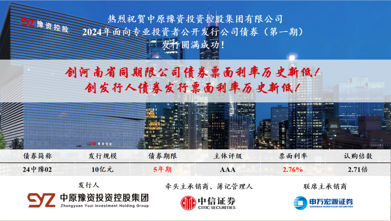 熱烈祝賀中原豫資投資控股集團有限公司2024年面向專業投資者公開發行公司債券(第一期)發行圓滿成功!2024年3月6日,中原豫資投資控股集團有限公司(以下簡稱“本集團”“豫資控股集團”)2024年面向專業投資者公開發行公司債券(第一期)(以下簡稱“本期債券”)成功簿…...