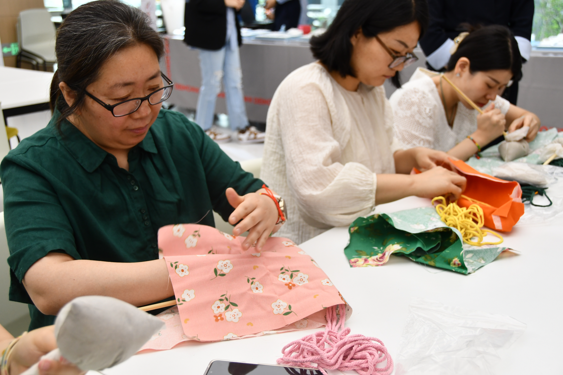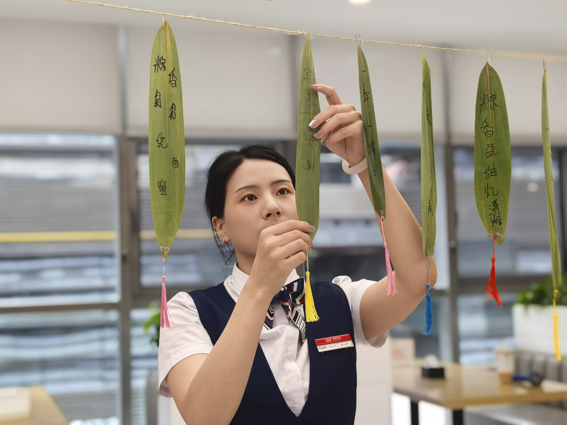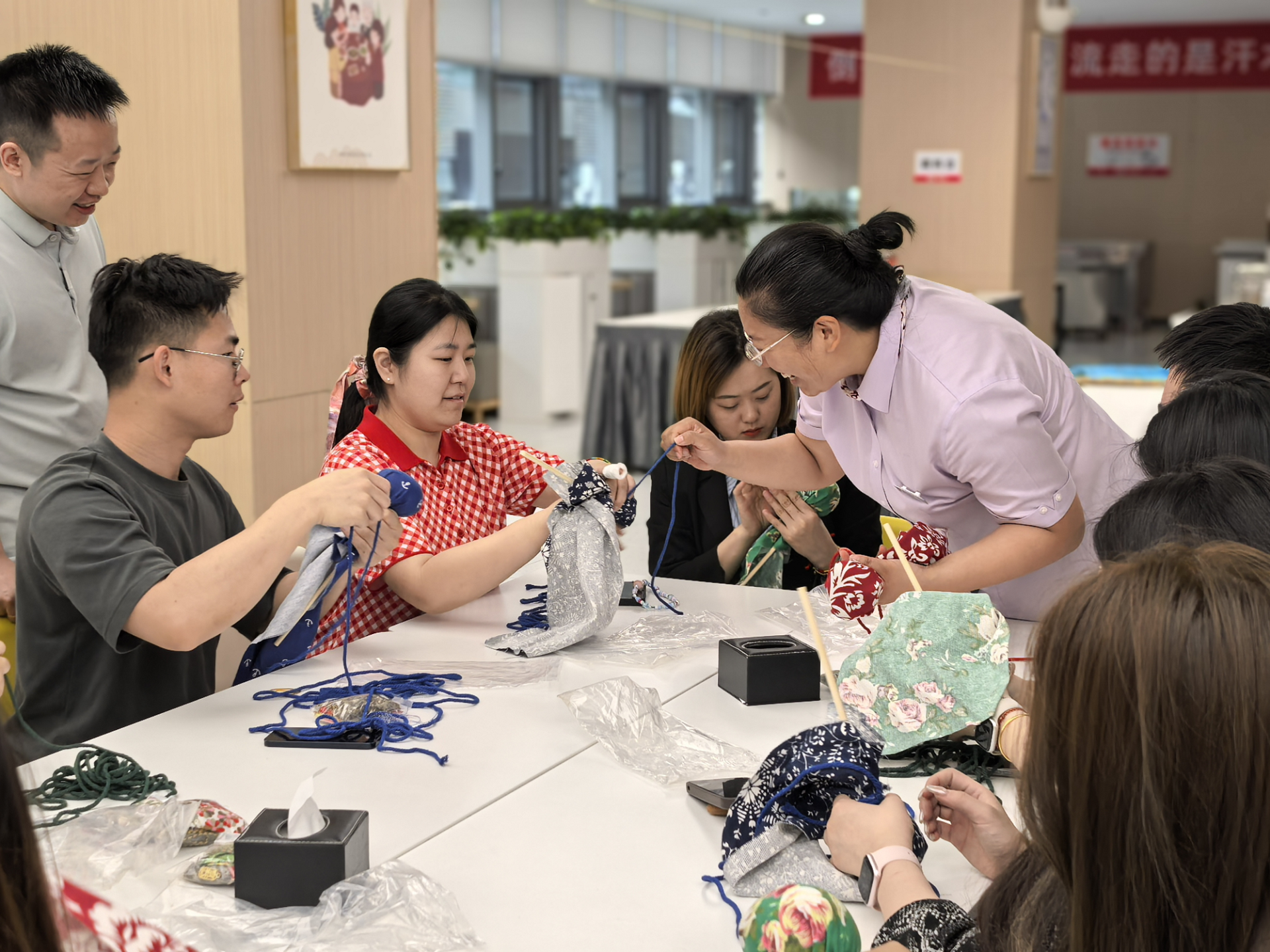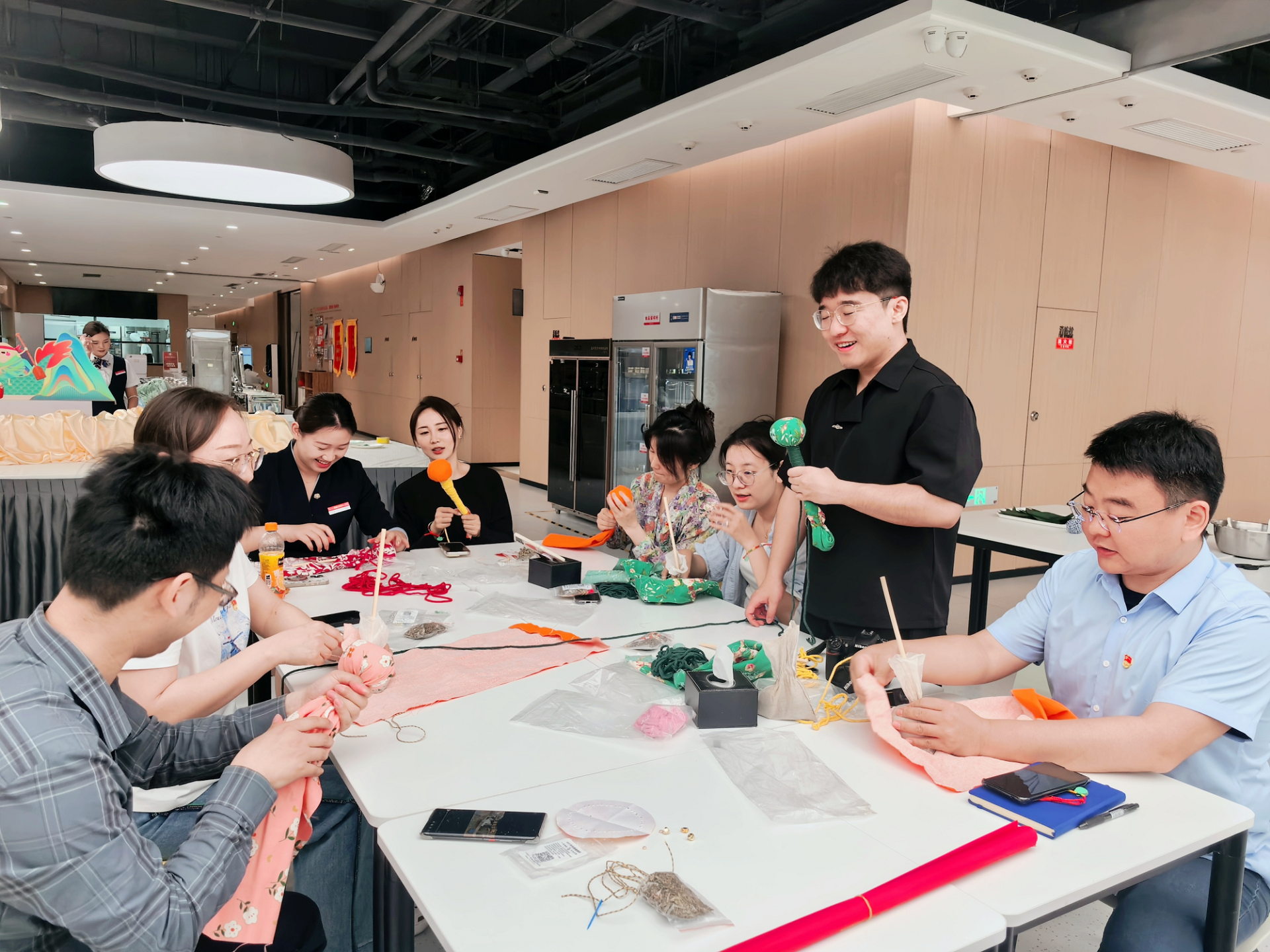 活動現場,職工們懸掛起“清廉端午”“節儉養德”等黨建標語,用寫有廉心寄語的粽葉裝點會場。同時,選用艾草、粗布、普通糯米等簡易材料,制作簡素粽品、香囊、艾錘,以實際行動踐行“節儉過節、廉潔過節”理念。手工DIY環節,職工們熱情高漲,紛紛挽起衣袖加入包粽子、制作香囊和艾錘的行列。在中國銀行金融島支行員工及餐廳工作人員的指導下,不一會兒,四角粽、長粽等各式粽品與艾草香囊、布制艾錘等傳統手作便制作完成。現場布置精心、氛圍濃厚,不僅讓職工們感受到了傳統文化的魅力,也深刻體會到了集團“家文化”的溫暖。